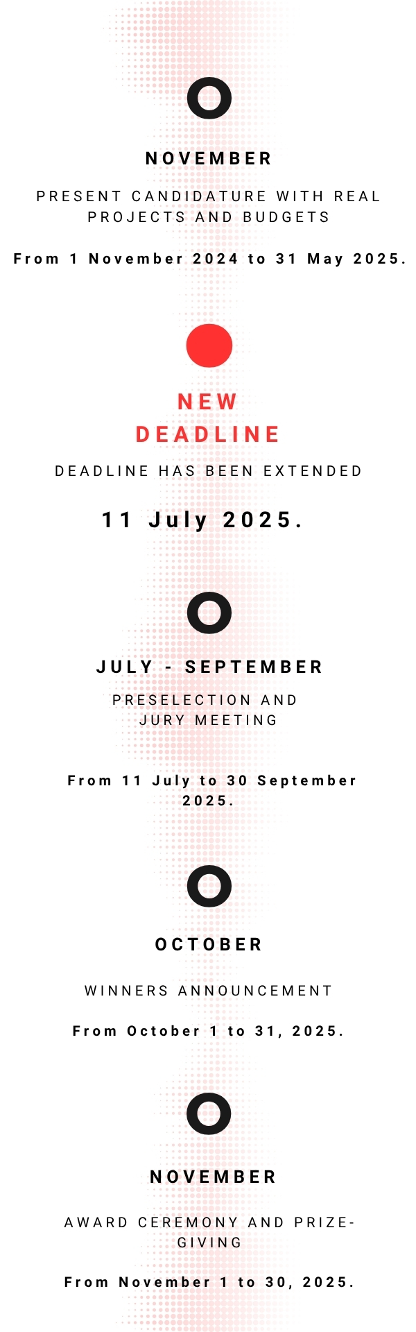 Entries will be open from 20 November 2024 until 31 May 2025. The deadline for receipt of projects is 31 May 2025. The deadline for receiving projects has been extended, so the new deadline is 11 July 2025. The pre-selection period will be from the start of registration until 30 September 2025. The jury will meet between 1 and 31 October 2025. The winners will be announced between October and November and the awards ceremony in November 2025. See our competition competition calendar for more details.
