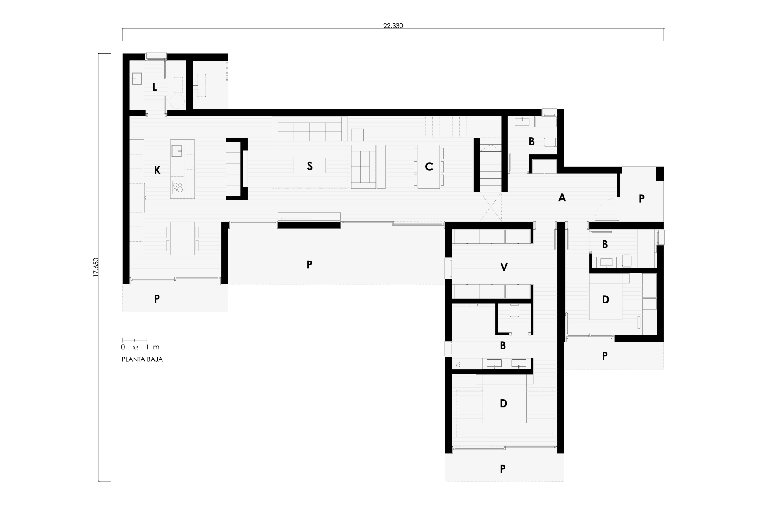 On the ground floor, the bodies at the ends close off the complex, creating an enclosed outdoor space, linked to the day area. The day area is articulated around this space for family enjoyment. Also on the ground floor, in another volume, there is a large master bedroom with dressing room and functional en suite bathroom, and another double bedroom with bathroom. The kitchen is articulated as another perpendicular arm, which ends up enveloping the outdoor space.
