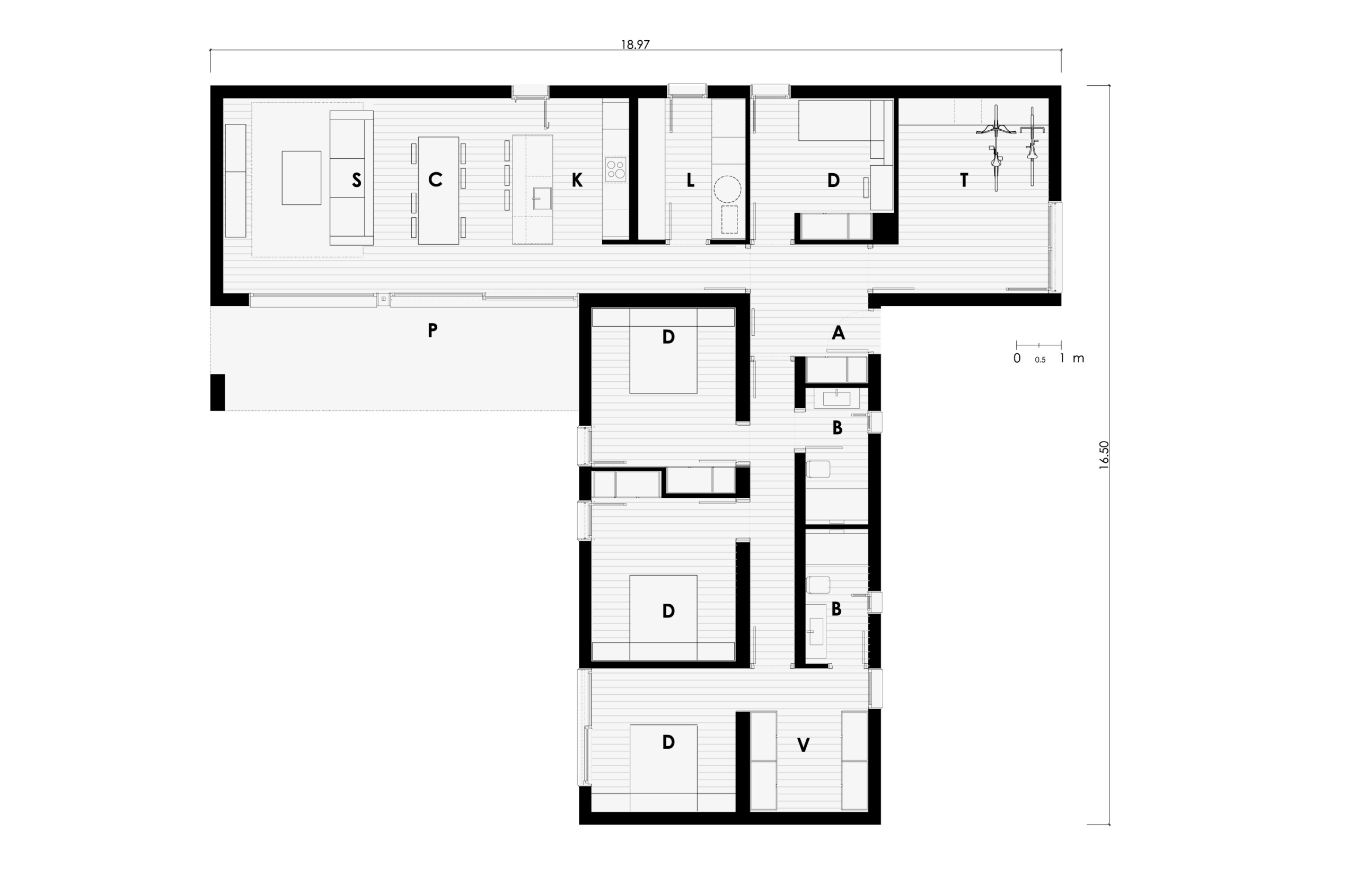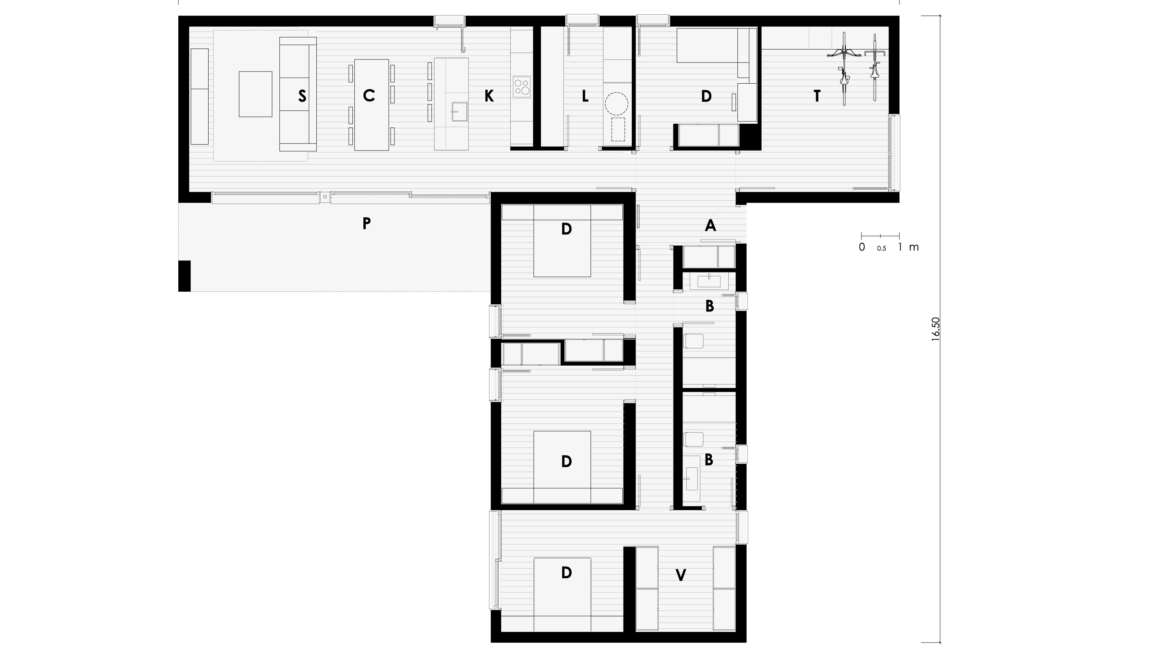 El acceso dispuesto en la zona central de la casa, permite distribuir a la derecha las zonas de día y a la izquierda las zonas de noche. El salón comedor y la cocina es abierto, configurando un espacio completamente abierto y diáfano, con continuidad visual hacia el exterior. Además existe la posibilidad de cerrarlo si el cliente así lo prefiere.