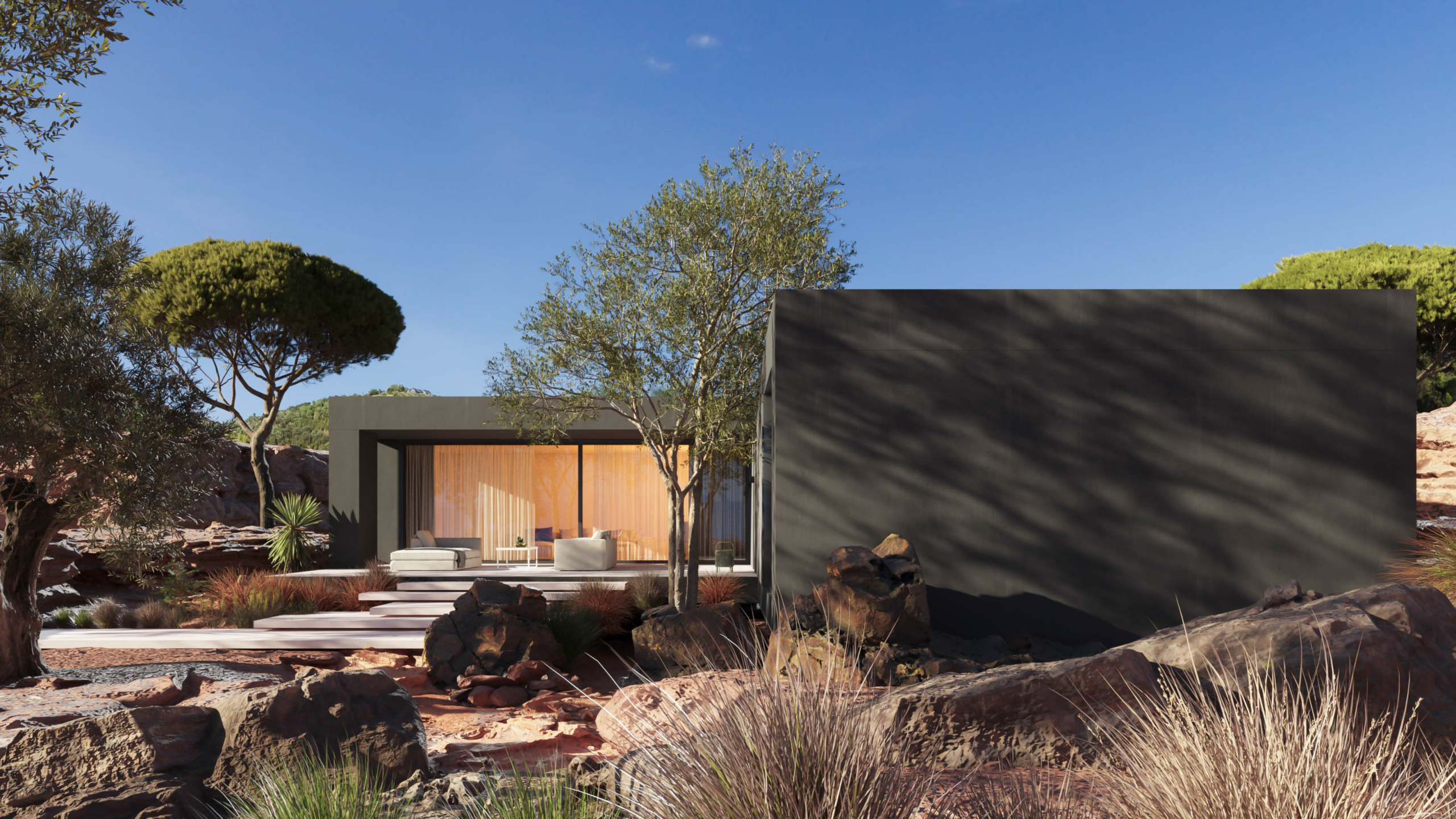 El volumen se diseña volcando todos los espacios nobles de la vivienda hacia el jardín y la piscina, creando una zona de porche vinculada a estos que permite disfrutar de un espacio de sombra en el exterior. La conexión visual con el jardín es directa desde todos los puntos de la vivienda, creando una relación exterior-interior excepcional y enfatizando la sensación de amplitud.