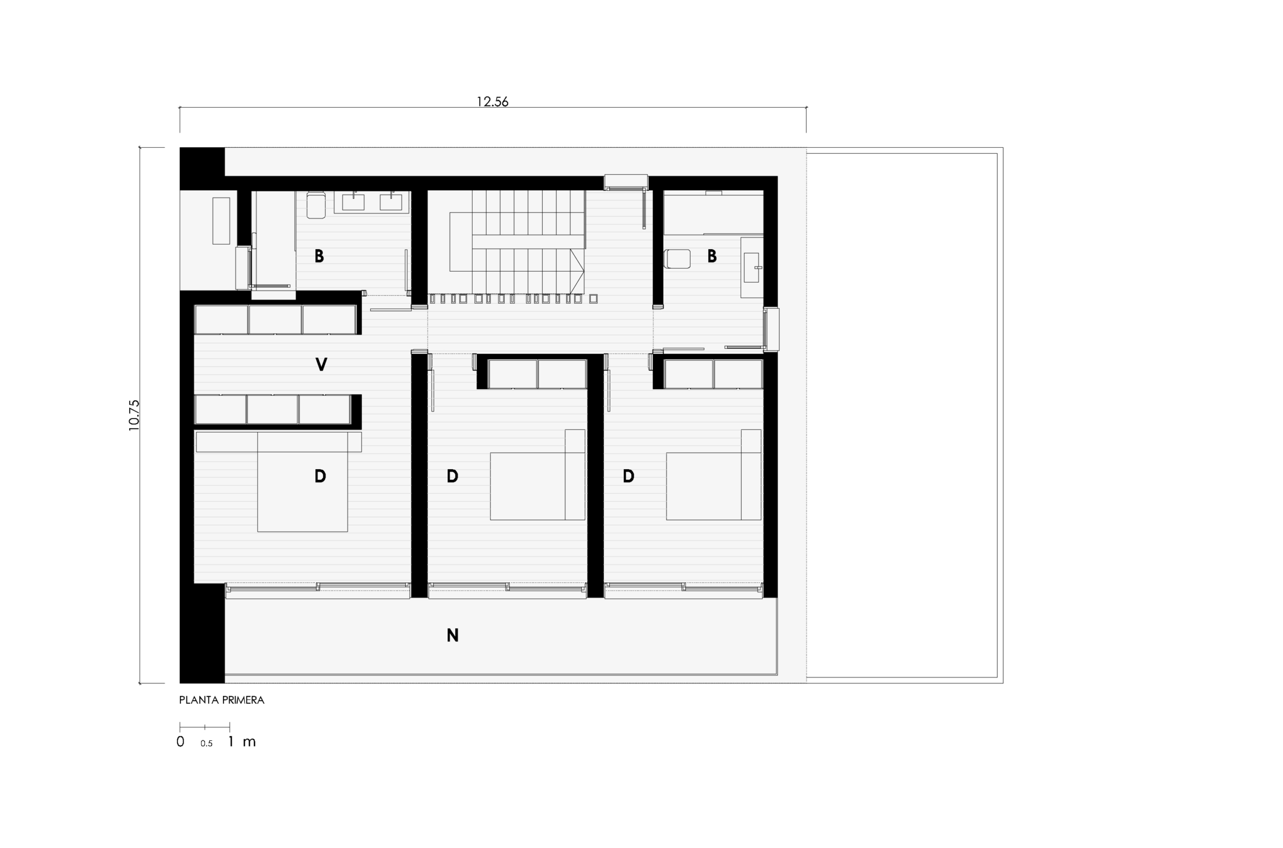 En la planta superior dos dormitorios dobles comparten un baño completo y la master room con vestidor con su propio espacio y un amplio baño principal completan el programa.